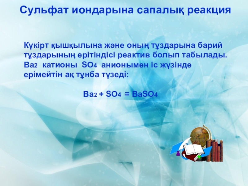 Сульфат иондарына сапалық реакцияКүкірт қышқылына және оның тұздарына барий тұздарының ерітіндісі реактив болып табылады. Ва2 катионы SО4