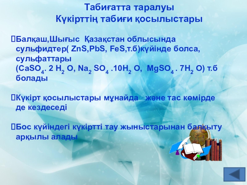 Табиғатта таралуыКүкірттің табиғи қосылыстарыБалқаш,Шығыс Қазақстан облысында сульфидтер( ZnS,PbS, FeS,т.б)күйінде болса,сульфаттары(СаSO4. 2 H2 O, Na2 SO4 .10H2 O,