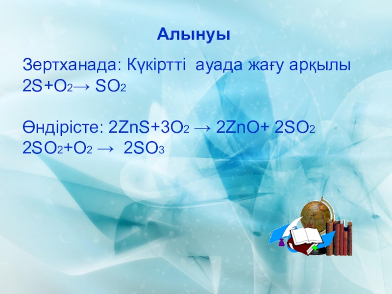 АлынуыЗертханада: Күкіртті ауада жағу арқылы 2S+O2→ SO2Өндірісте: 2ZnS+3O2 → 2ZnO+ 2SO22SO2+O2 → 2SO3