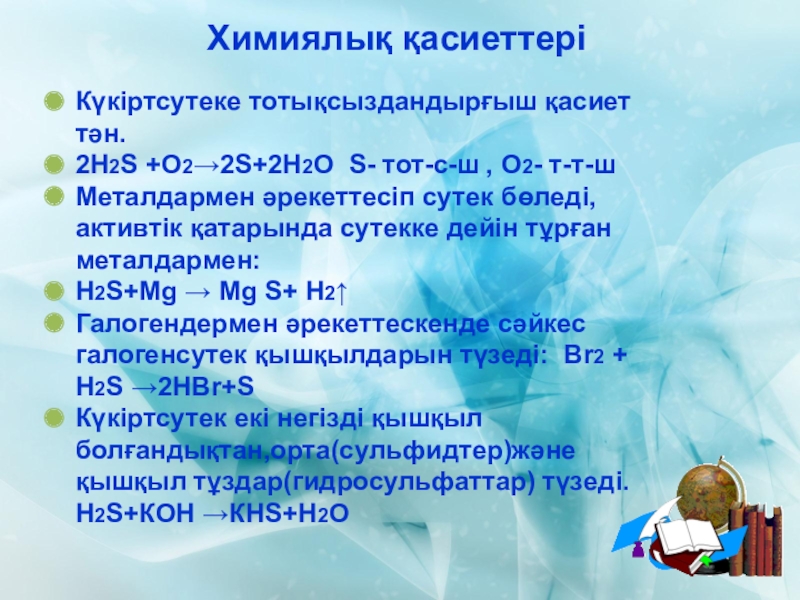 Химиялық қасиеттеріКүкіртсутеке тотықсыздандырғыш қасиет тән.2Н2S +O2→2S+2H2O S- тот-с-ш , O2- т-т-шМеталдармен әрекеттесіп сутек бөледі,активтік қатарында сутекке дейін