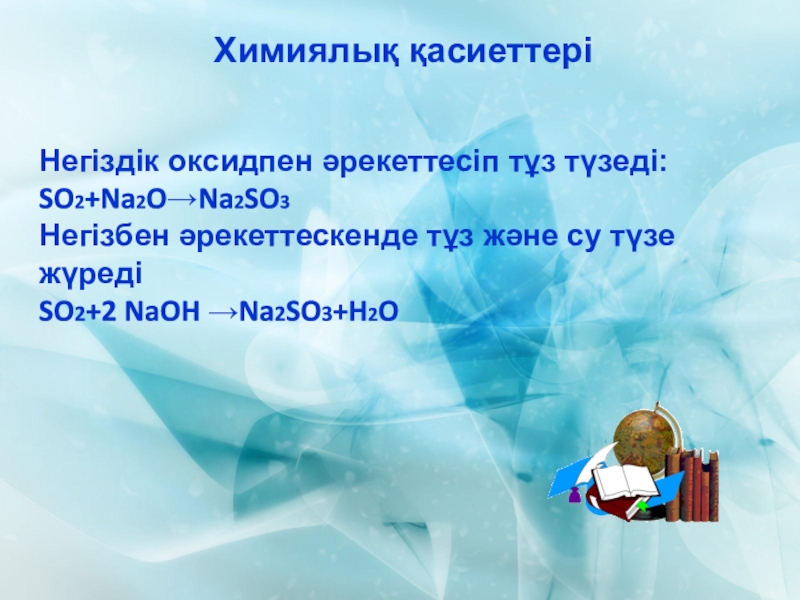 Химиялық қасиеттеріНегіздік оксидпен әрекеттесіп тұз түзеді: SO2+Na2O→Na2SO3Негізбен әрекеттескенде тұз және су түзе жүредіSO2+2 NaOH →Na2SO3+H2O