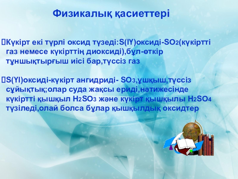 Физикалық қасиеттеріКүкірт екі түрлі оксид түзеді:S(ІҮ)оксиді-SO2(күкіртті газ немесе күкірттің диоксиді),бұл-өткір тұншықтырғыш иісі бар,түссіз газS(ҮІ)оксиді-күкірт ангидриді- SO3,ұшқыш,түссіз сұйықтық;олар