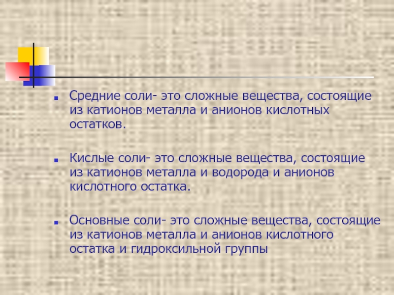 Слайд 12Средние соли- это сложные вещества, состоящие из катионов металла и анионов