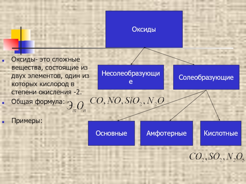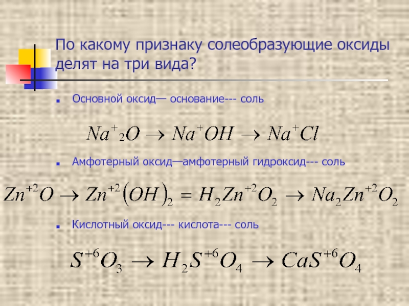 По какому признаку солеобразующие оксиды делят на три вида?Основной оксид— основание--- соль Амфотерный оксид—амфотерный гидроксид--- сольКислотный оксид---