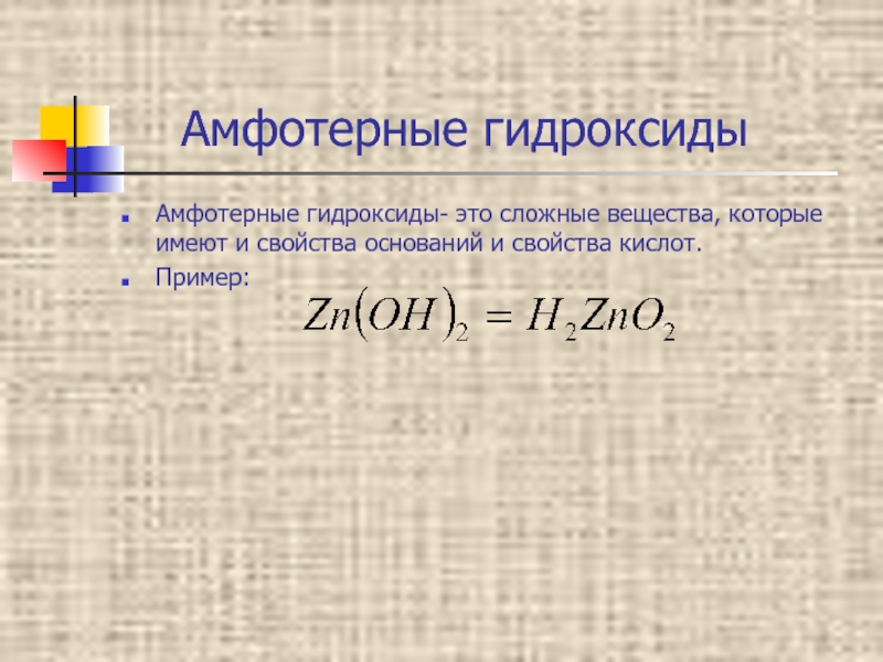 Амфотерные гидроксидыАмфотерные гидроксиды- это сложные вещества, которые имеют и свойства оснований и свойства кислот.Пример: