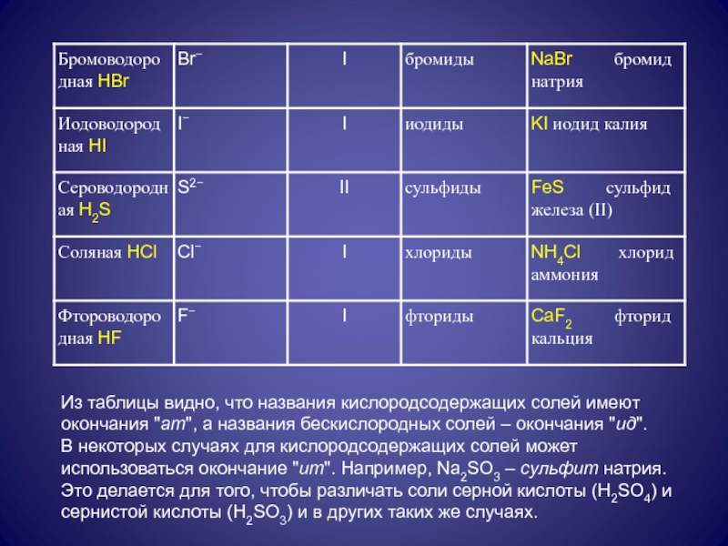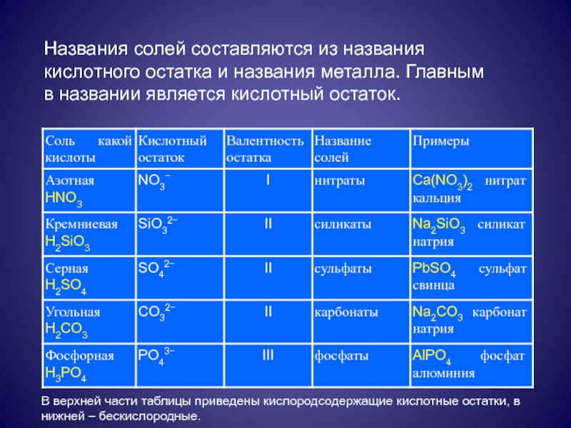 В верхней части таблицы приведены кислородсодержащие кислотные остатки, в нижней – бескислородные.