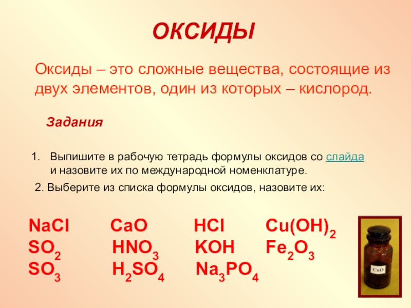 Выпишите в рабочую тетрадь формулы оксидов со слайда и назовите их по международной номенклатуре.