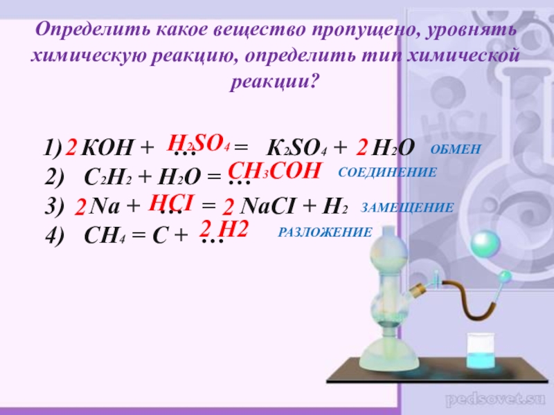 1) КОН + … = К2SO4 + H2O 2) C2H2 + H2O = … 3) Na + … = NaCI + H2 4) CH4 = C + …