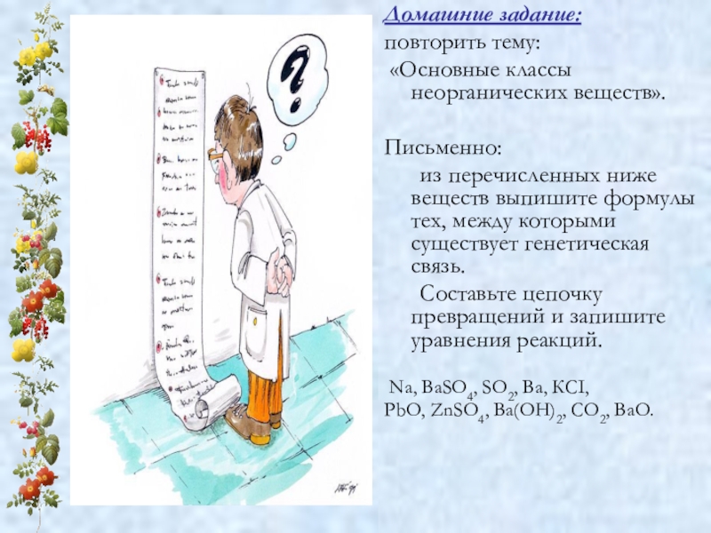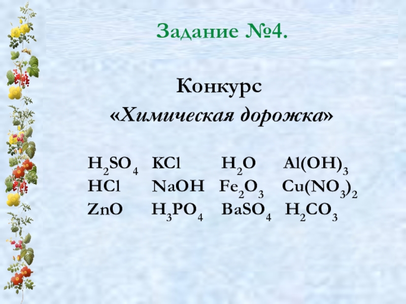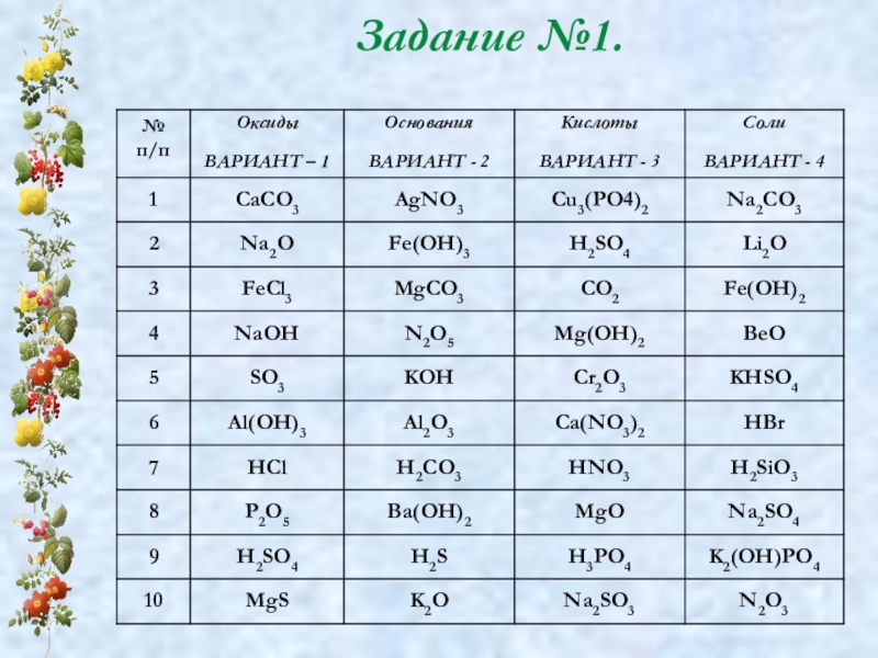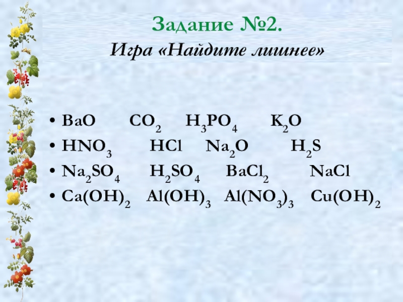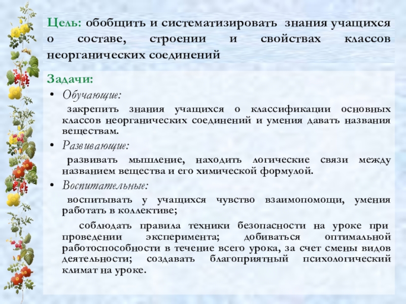 закрепить знания учащихся о классификации основных классов неорганических соединений и умения давать названия веществам.