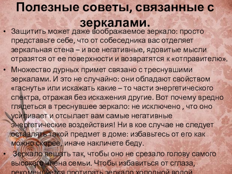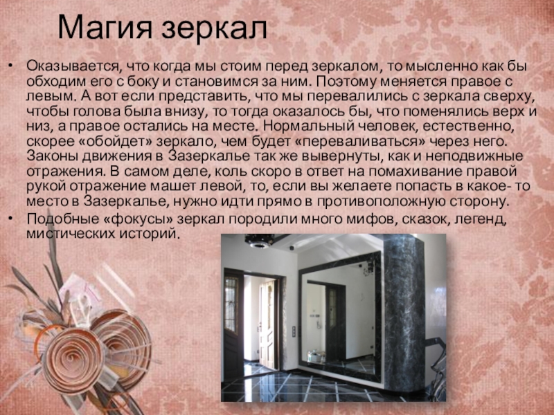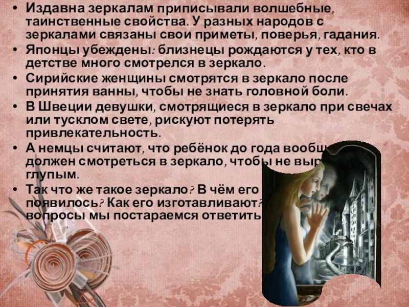 Слайд 3Издавна зеркалам приписывали волшебные, таинственные свойства. У разных народов с зеркалами