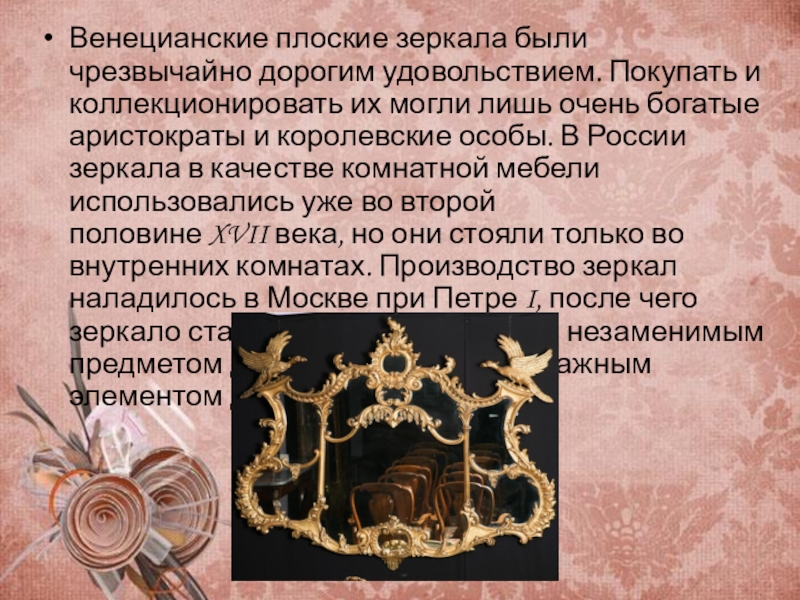 Слайд 5Венецианские плоские зеркала были чрезвычайно дорогим удовольствием. Покупать и коллекционировать их