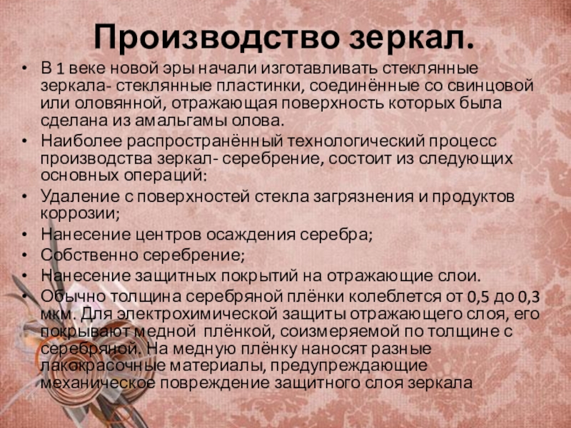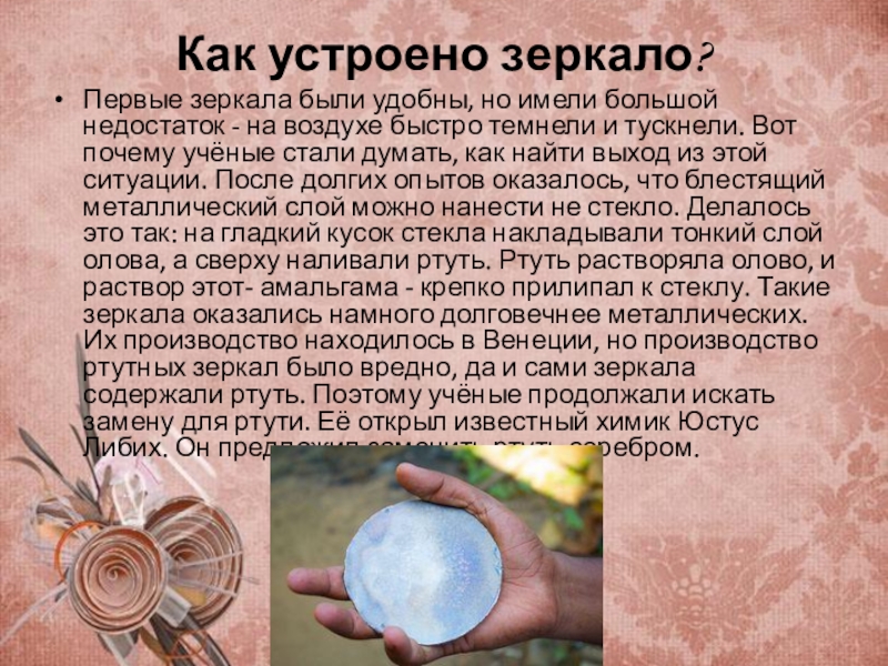 на воздухе быстро темнели и тускнели. Вот почему учёные стали думать, как найти выход из этой ситуации. После долгих опытов оказалось, что блестящий металлический слой можно нанести не стекло. Делалось это так: на гладкий кусок стекла накладывали тонкий слой олова, а сверху наливали ртуть. Ртуть растворяла олово, и раствор этот- амальгама - крепко прилипал к стеклу. Такие зеркала оказались намного долговечнее металлических. Их производство находилось в Венеции, но производство ртутных зеркал было вредно, да и сами зеркала содержали ртуть. Поэтому учёные продолжали искать замену для ртути. Её открыл известный химик Юстус Либих. Он предложил заменить ртуть серебром.