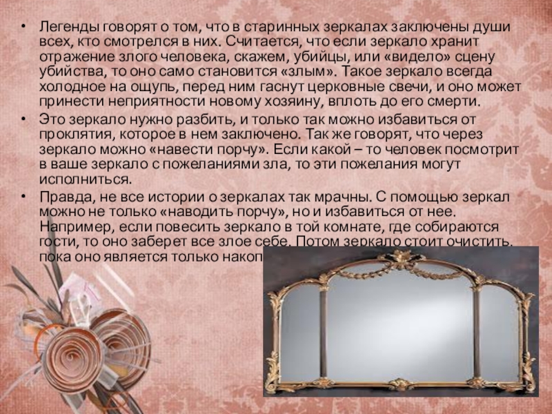 Слайд 9Легенды говорят о том, что в старинных зеркалах заключены души всех,