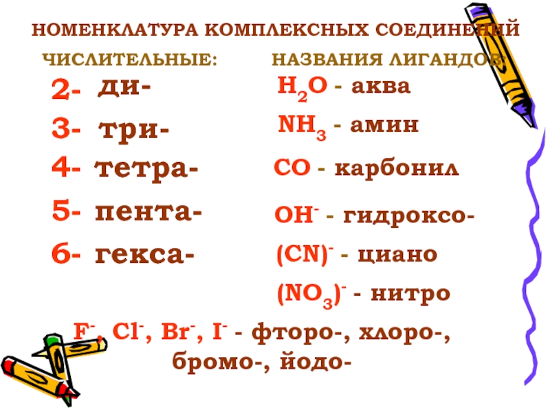 F-, Cl-, Br-, I- - фторо-, хлоро-, бромо-, йодо-