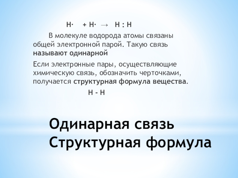 Одинарная связь Структурная формула        Н∙  + Н∙ →