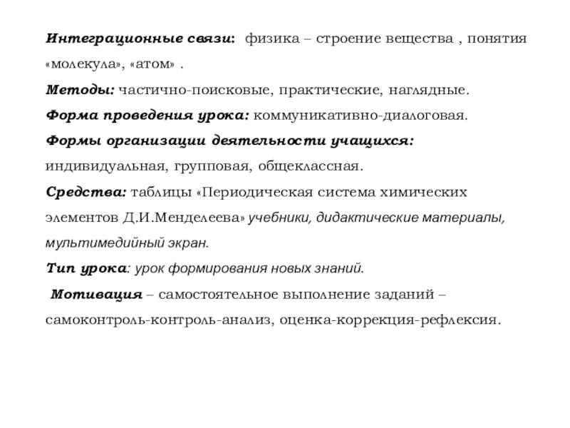 Интеграционные связи:  физика – строение вещества , понятия «молекула», «атом» . Методы: частично-поисковые, практические, наглядные.Форма проведения урока: коммуникативно-диалоговая.Формы