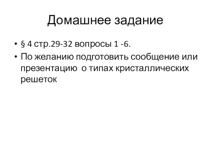 Домашнее задание§ 4 стр.29-32 вопросы 1 -6. По желанию подготовить сообщение или презентацию о типах кристаллических решеток