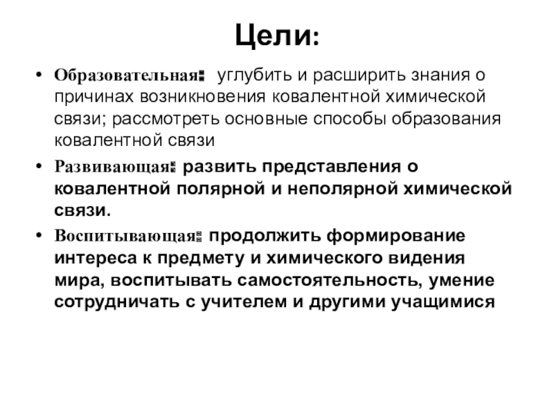 Образовательная: углубить и расширить знания о причинах возникновения ковалентной химической связи;