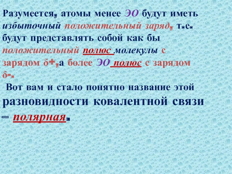 Слайд 29Разумеется, атомы менее ЭО будут иметь избыточный положительный заряд, т.е. будут