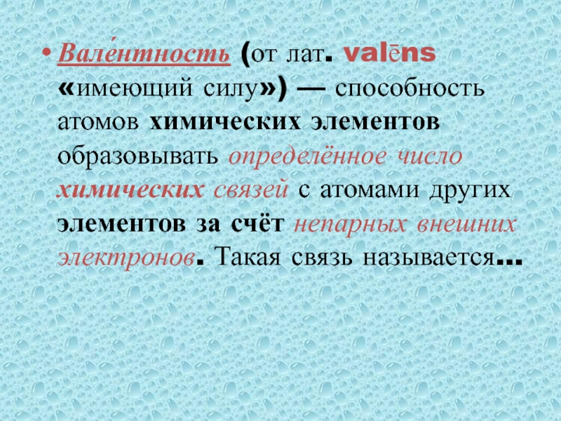 Слайд 9Вале́нтность (от лат. valēns «имеющий силу») — способность атомов химических элементов