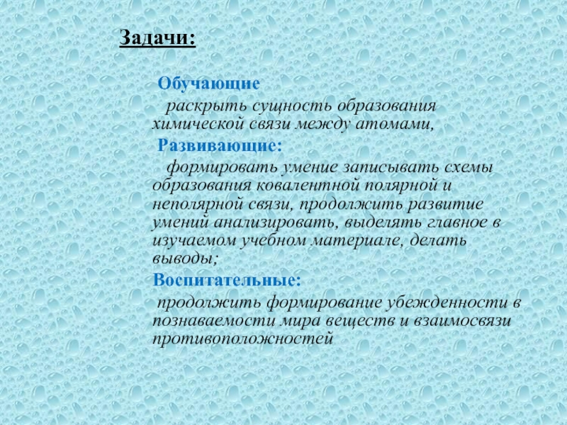 формировать умение записывать схемы образования ковалентной полярной и неполярной связи, продолжить развитие умений анализировать, выделять главное в изучаемом учебном материале, делать выводы;