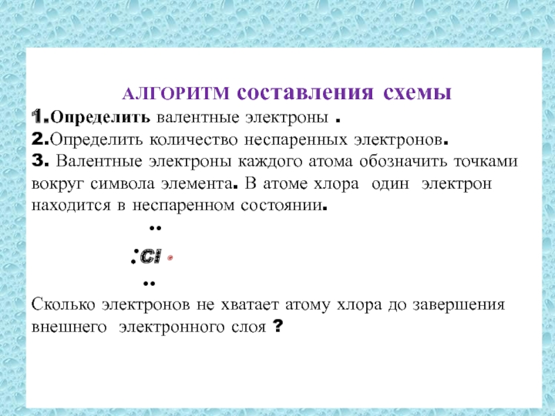 Валентные электроны каждого атома обозначить точками вокруг символа элемента. В атоме хлора один электрон находится в неспаренном состоянии.