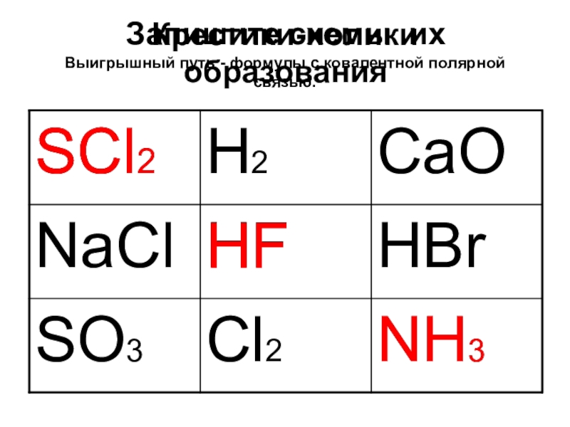 Слайд 7Крестики-нолики Выигрышный путь - формулы с ковалентной полярной связью.