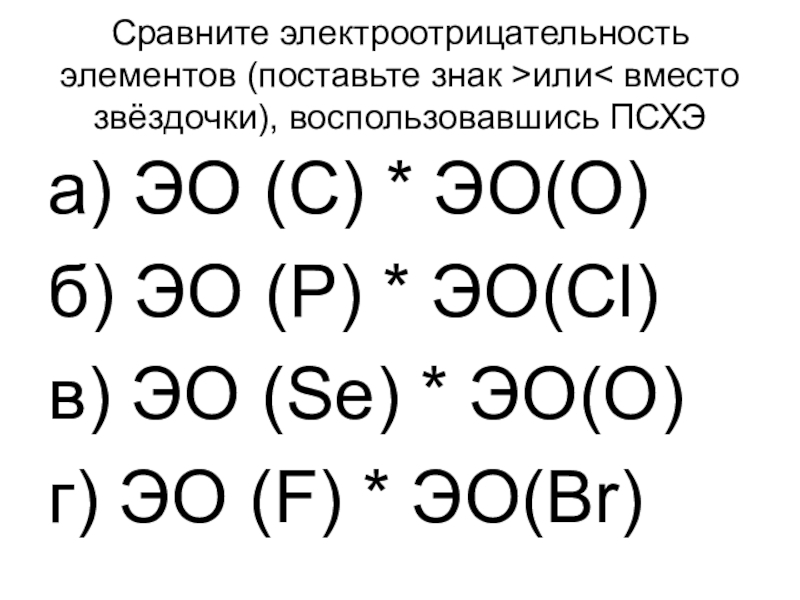 Слайд 6Сравните электроотрицательность элементов (поставьте знак >или< вместо звёздочки), воспользовавшись ПСХЭ
