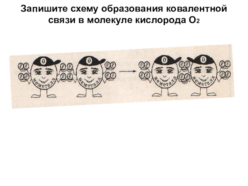 Слайд 2Запишите схему образования ковалентной связи в молекуле кислорода О2