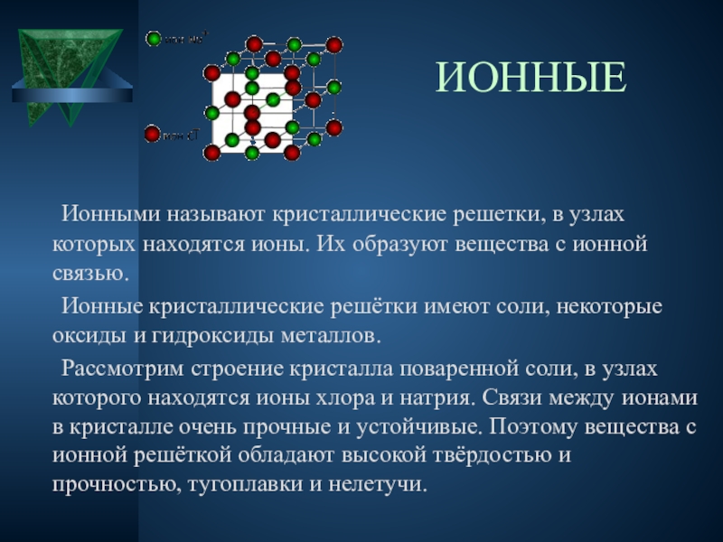 Рассмотрим строение кристалла поваренной соли, в узлах которого находятся ионы хлора и натрия. Связи между ионами в кристалле очень прочные и устойчивые. Поэтому вещества с ионной решёткой обладают высокой твёрдостью и прочностью, тугоплавки и нелетучи.