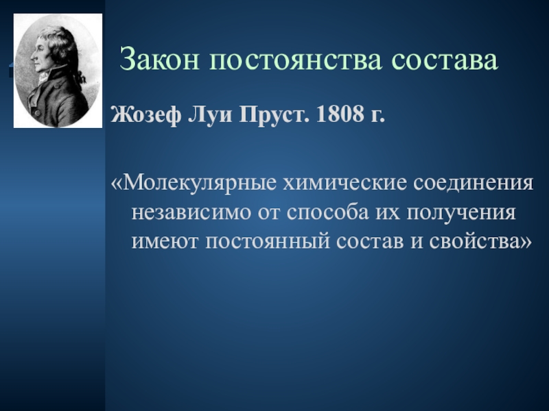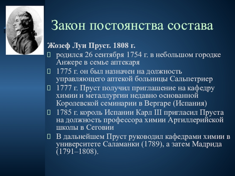 Закон постоянства составаЖозеф Луи Пруст. 1808 г. родился 26 сентября 1754 г. в небольшом городке Анжере в