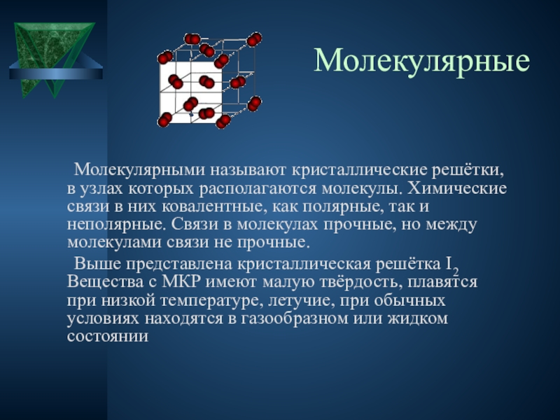 Молекулярные	Молекулярными называют кристаллические решётки, в узлах которых располагаются молекулы. Химические связи в них ковалентные, как полярные, так