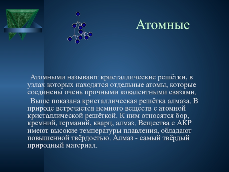 Выше показана кристаллическая решётка алмаза. В природе встречается немного веществ с атомной кристаллической решёткой. К ним относятся бор, кремний, германий, кварц, алмаз. Вещества с АКР имеют высокие температуры плавления, обладают повышенной твёрдостью. Алмаз - самый твёрдый природный материал.
