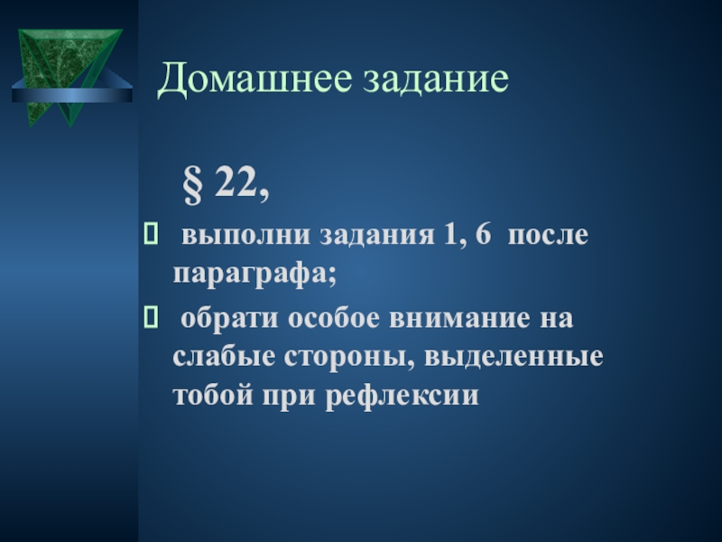 Домашнее задание	§ 22, выполни задания 1, 6 после параграфа; обрати особое внимание на слабые стороны, выделенные тобой