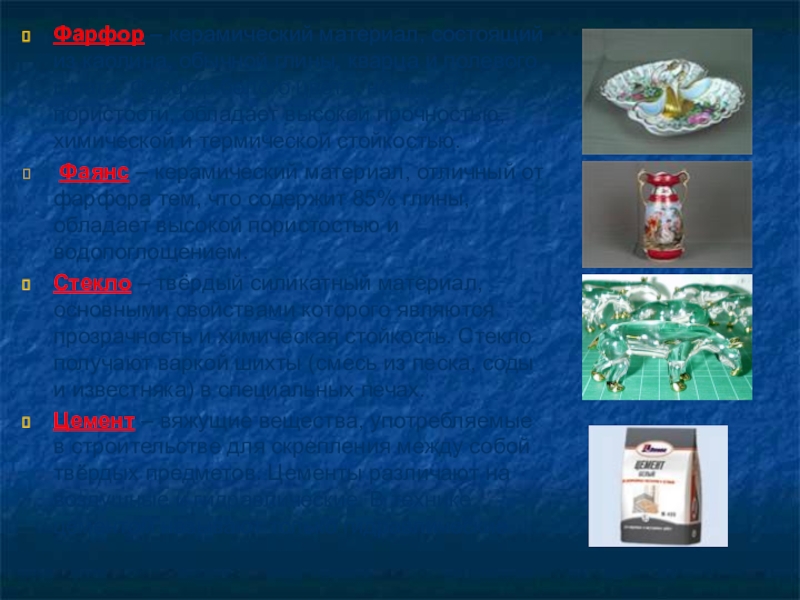 Слайд 24Фарфор – керамический материал, состоящий из каолина, обычной глины, кварца и