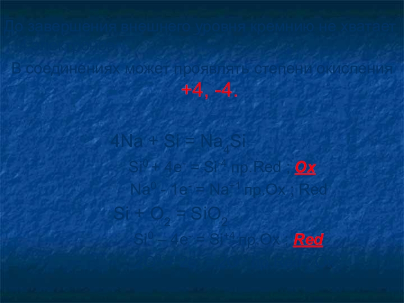 Si+4 + 4e- = Si0 пр. Red ; Ox