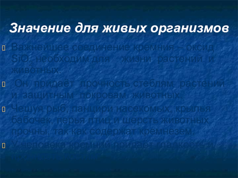 Чешуя рыб, панцири насекомых, крылья бабочек, перья птиц и шерсть животных прочны, так как содержат кремнезем.