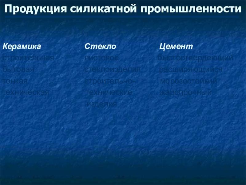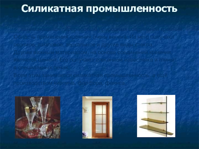 Силикатная промышленность – отрасль промышленности, занимающаяся переработкой природных соединений кремния.