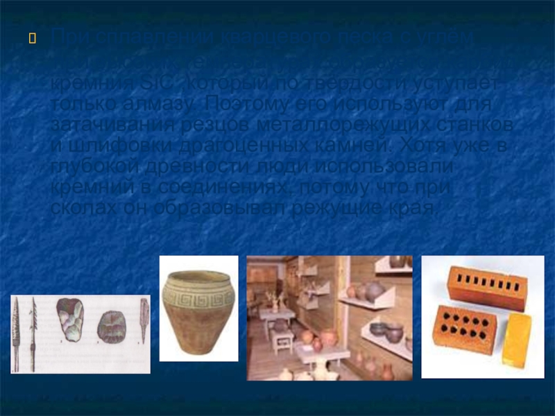 карбид кремния SiC ,который по твёрдости уступает только алмазу. Поэтому его используют для затачивания резцов металлорежущих станков и шлифовки драгоценных камней. Хотя уже в глубокой древности люди использовали кремний в соединениях, потому что при сколах он образовывал режущие края.