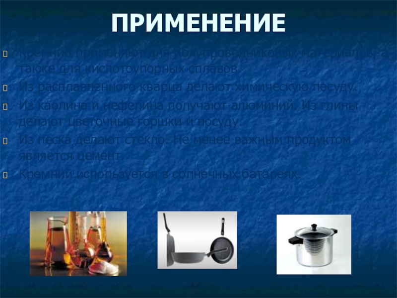 Кремний применяют для полупроводниковых материалов, а также для кислотоупорных сплавов.