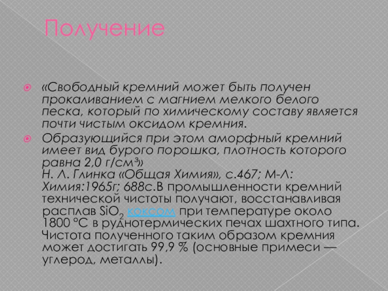 «Свободный кремний может быть получен прокаливанием с магнием мелкого белого песка,