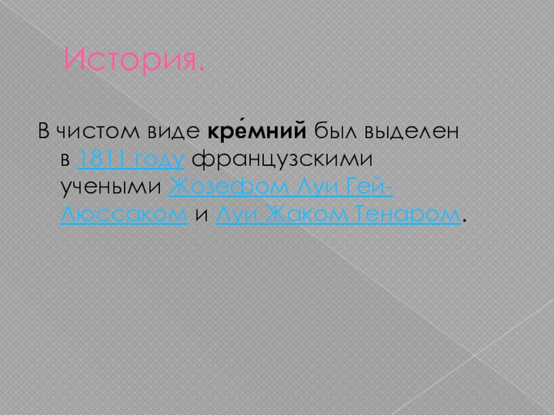 В чистом виде кре́мний был выделен в 1811 году французскими учеными Жозефом Луи Гей-Люссаком и Луи Жаком Тенаром.