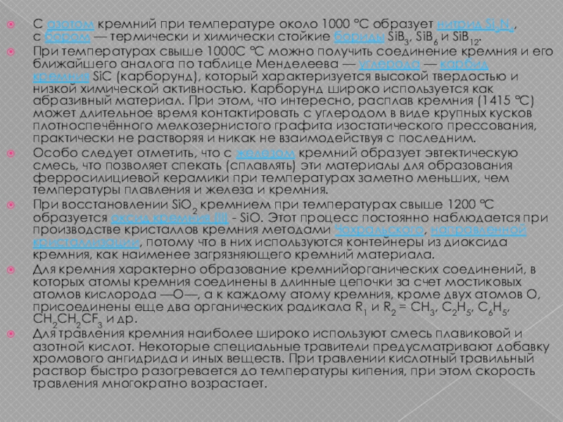 Слайд 9С азотом кремний при температуре около 1000 °C образует нитрид Si3N4, с бором — термически и химически