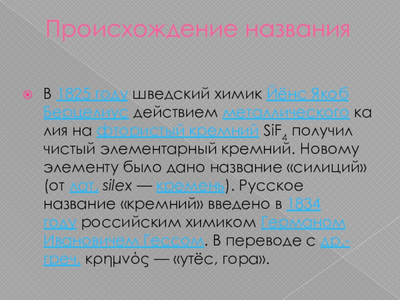 Новому элементу было дано название «силиций» (от лат. silex — кремень). Русское название «кремний» введено в 1834 году российским химиком Германом Ивановичем Гессом. В переводе c др.-греч. κρημνός — «утёс, гора».