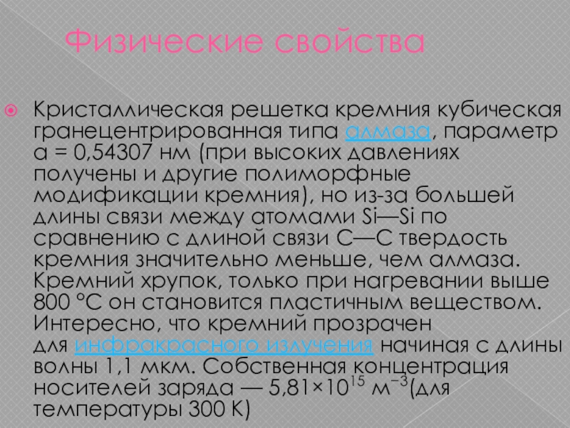 нм (при высоких давлениях получены и другие полиморфные модификации кремния), но из-за большей длины связи между атомами Si—Si по сравнению с длиной связи С—С твердость кремния значительно меньше, чем алмаза. Кремний хрупок, только при нагревании выше 800 °C он становится пластичным веществом. Интересно, что кремний прозрачен для инфракрасного излучения начиная с длины волны 1,1 мкм. Собственная концентрация носителей заряда — 5,81×1015 м−3(для температуры 300 K)