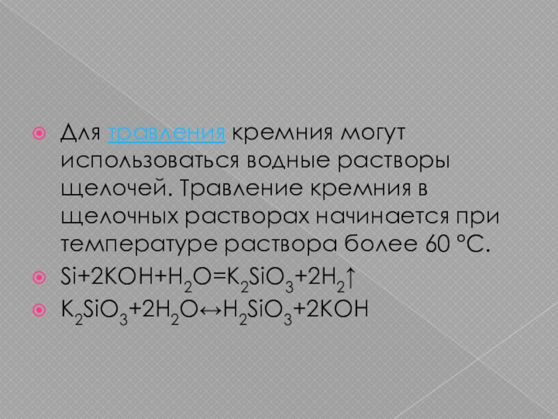 Слайд 10Для травления кремния могут использоваться водные растворы щелочей. Травление кремния в щелочных растворах