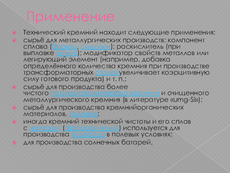 Технический кремний находит следующие применения: