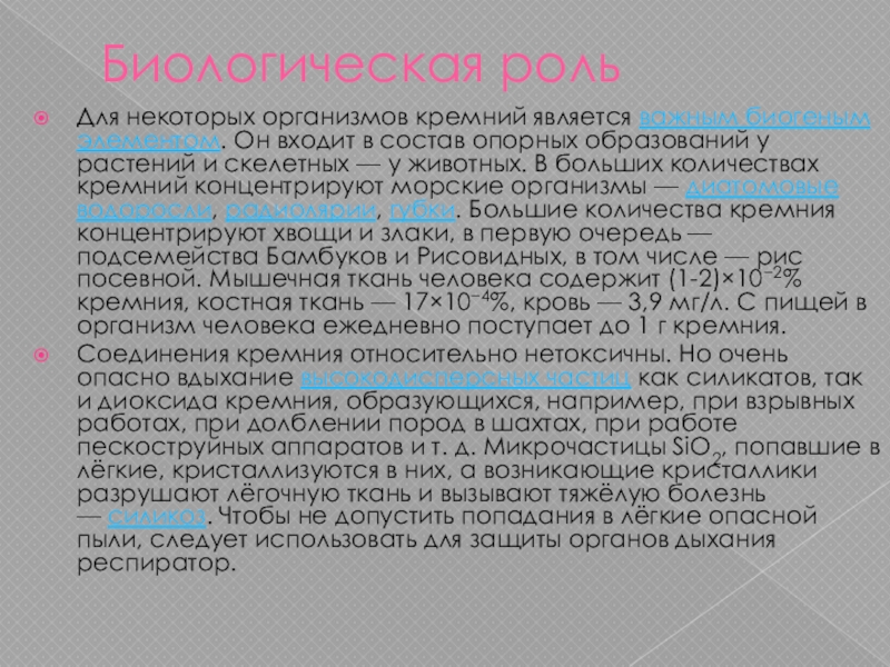 состав опорных образований у растений и скелетных — у животных. В больших количествах кремний концентрируют морские организмы — диатомовые водоросли, радиолярии, губки. Большие количества кремния концентрируют хвощи и злаки, в первую очередь — подсемейства Бамбуков и Рисовидных, в том числе — рис посевной. Мышечная ткань человека содержит (1-2)×10−2% кремния, костная ткань — 17×10−4%, кровь — 3,9 мг/л. С пищей в организм человека ежедневно поступает до 1 г кремния.