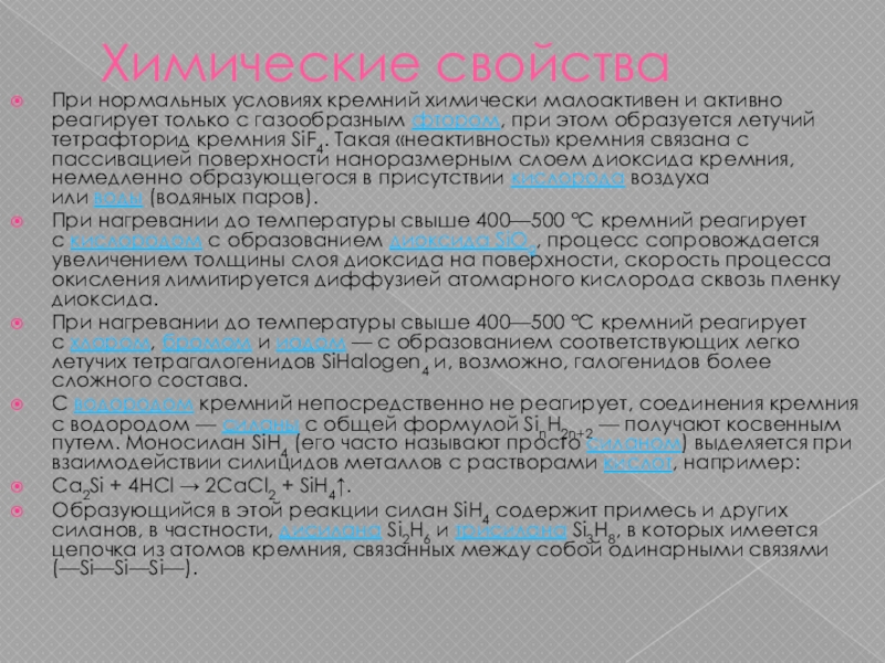При нормальных условиях кремний химически малоактивен и активно реагирует только