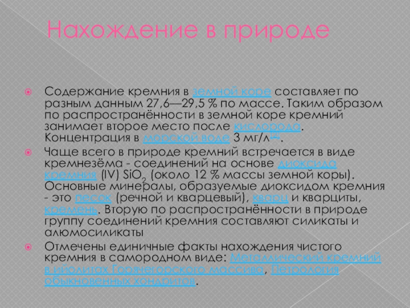 Содержание кремния в земной коре составляет по разным данным 27,6—29,5 % по